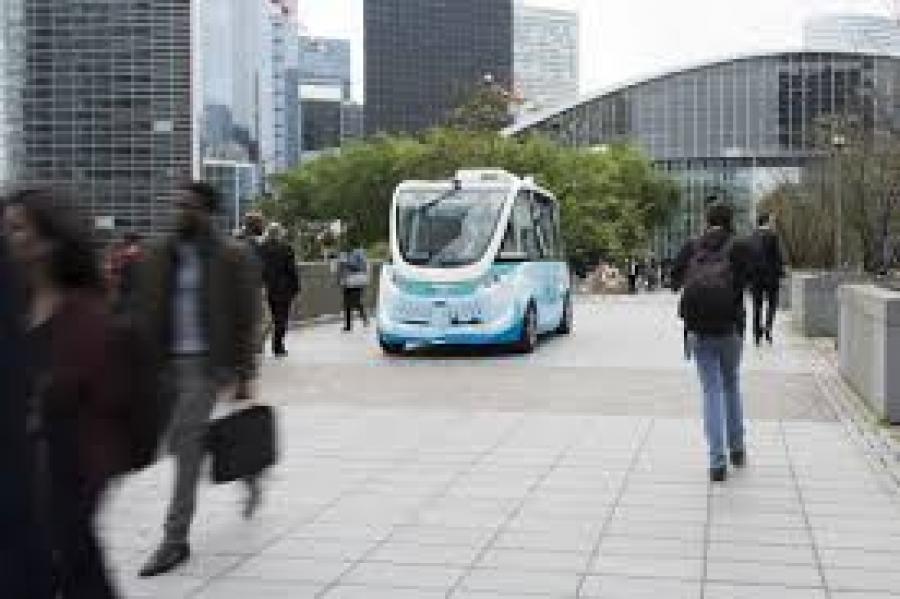 The autonomous shuttle looks like a Kombi van, a little closer to the ground. It plies its way up and down a wide and leafy boulevard sandwiched between two busy main streets.