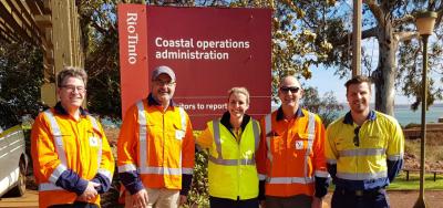 During a visit to Rio Tinto's Western Australia operations in June are, from left: DOC's deputy director general of operations Mike Slater, DOC director-general Lou Sanson, Rio Tinto's Dampier Ports operations general manager Jessica Farrell, DOC's director of health and safety Harry Maher, and Rio Tinto's Dampier Ports operations environmental manager Marty Buck. Photo: DOC During a visit to Rio Tinto's Western Australia operations in June are, from left: DOC's deputy director general of operations Mike Slater, DOC director-general Lou Sanson, Rio Tinto's Dampier Ports operations general manager Jessica Farrell, DOC's director of health and safety Harry Maher, and Rio Tinto's Dampier Ports operations environmental manager Marty Buck. Photo: DOC