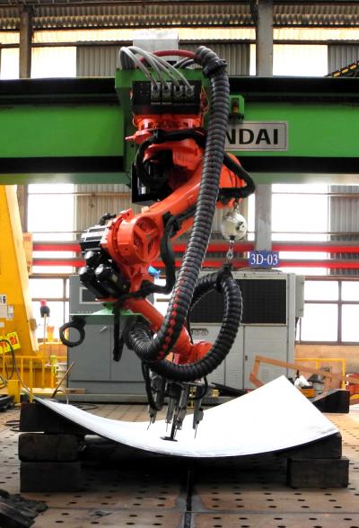 The world's largest shipbuilder has recently completed a year of testing of a robotic system that automatically shapes a vessel's 3-D curved surface at its shipyard in Ulsan, located 414 kilometers southeast of Seoul.