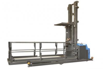 This man-up truck features a long platform to enable the operator to access long products stored at height. It is fitted with guide rollers to enable it to operate in existing guided narrow aisles of just 1.4m – the same width as those needed for Combilift’s GT truck. It enables operators to easily and safely hand pick orders for customers from the elevated platform and it has a capacity of 450 kg. Its overhead guard, light anti-slip floor, self-closing platform gate and guard rails guarantee utmost safety, as does the travel speed and steering angle that automatically adjusts according to lift heights.