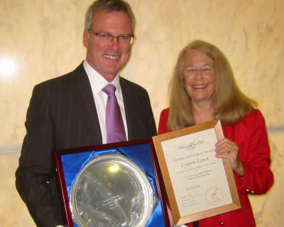 Miss Lawn is photographed in The Beehive in 2006 receiving her National Press Club Lifetime Achievement Award from Minister of Broadcasting Steve Maharey.
