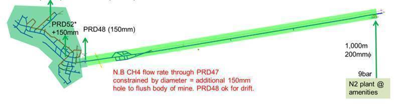· Flush methane from the mine using nitrogen injection from the portal seal. · Methane will be discharged from the mine through boreholes (one of them yet to be drilled). The purpose of doing this is to establish and maintain a non-flammable inert atmosphere over the roof fall at the end of the drift access tunnel, which has the potential to re-ignite if exposed to fresh air.· (While the current atmosphere of 96% CH4 is both non-flammable and inert, it can form a potentially explosive atmosphere when mixed with fresh air.)· Throughout the drift re-entry phase the roof fall area will be maintained as a nitrogen-rich atmosphere through the injection of nitrogen down the same two boreholes used to flush the methane. This will prevent fresh air being present over the roof fall through the provision of a higher static pressure in the mine workings than that in the drift. · The nitrogen will leave the drift through a borehole on the portal / drift tunnel entrance side of the roof fall.