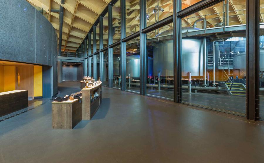A stony, dark grey shade was chosen to match the natural tones and hues of the site. This choice was also a great way to use the floor as a backdrop on which the colours of the timber roof, copper stills, wooden barrels and golden whisky bottles could pop and stand out. The grey Flowfast Quartz Structure finish was even applied on the innovative suspended walkway that runs across the top of the distillery’s large tanks.