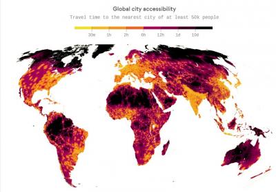 Map shows travel time to the nearest city with at least 50,000 residents. We're guessing it concerns travelling on foot...?