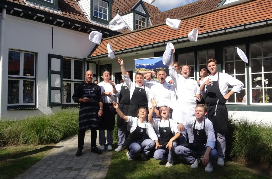 Trainee Belgian chefs celebrate what they have learned about NZ venison from NZ chefs Graham Brown (centre) and Shannon Campbell (far left)