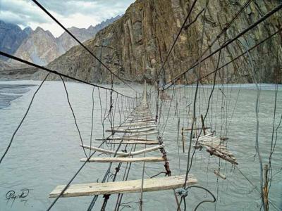 The swinging bridge stretches across the Hunza river and is covered with all sorts of cracks. And to make matters worse, the tattered remnants of the old bridge hangs nearby.