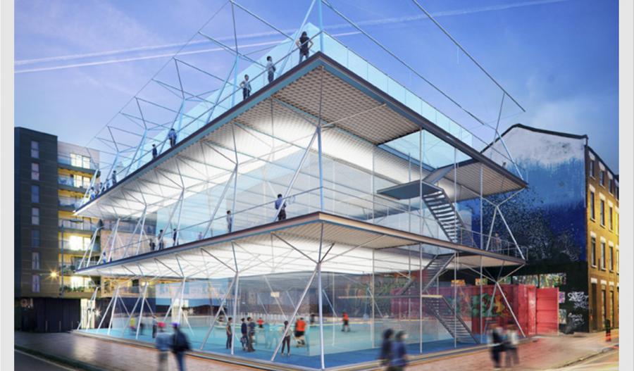 Designed specifically for use in urban areas where space is limited and safety is a concern, AL_A’s stackable Pitch/Pitch sports fields turn athletic endeavors into a community event. The clear sided structures provide views for passersby, and for spectators, covered walkways around the pitches provide up-close enjoyment of the action. The pitches can be configured for different sports, including football, basketball and hockey, and for different sized teams starting with three-a-side. Integrated lighting and stairwells, as well as the lightweight carbon fiber material, mean the pitches can be constructed and deconstructed quickly and easily. The design team envisions Pitch/Pitch structures…
