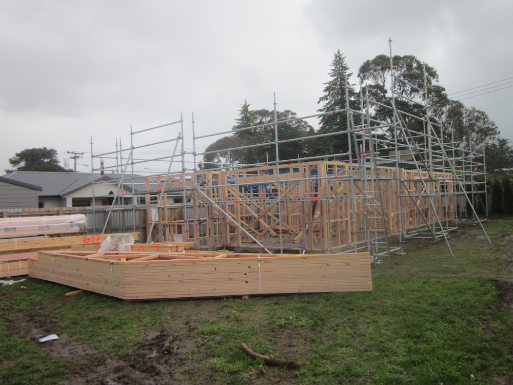 Napier, MSCNewsWire, Sunday 10 July 2016 - The cost of the tiny kitset house in our photograph will increase by around $15,000 because of the elaborate scaffolding and safety netting (blue rope net in photo) required with reinforced building safety codes.