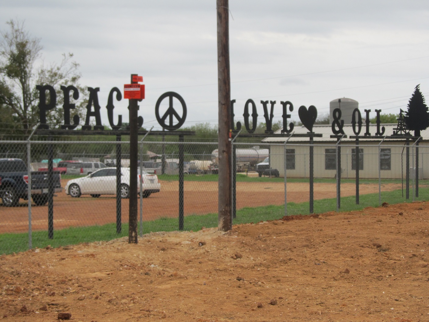 We drive for an hour to Atascosa County with its newly minted mining towns. A steel sign proclaims ‘Peace, Love and Oil’, yards are full of pipes and other equipment lying idle. There’s a fear these could soon become brand new ghost towns.